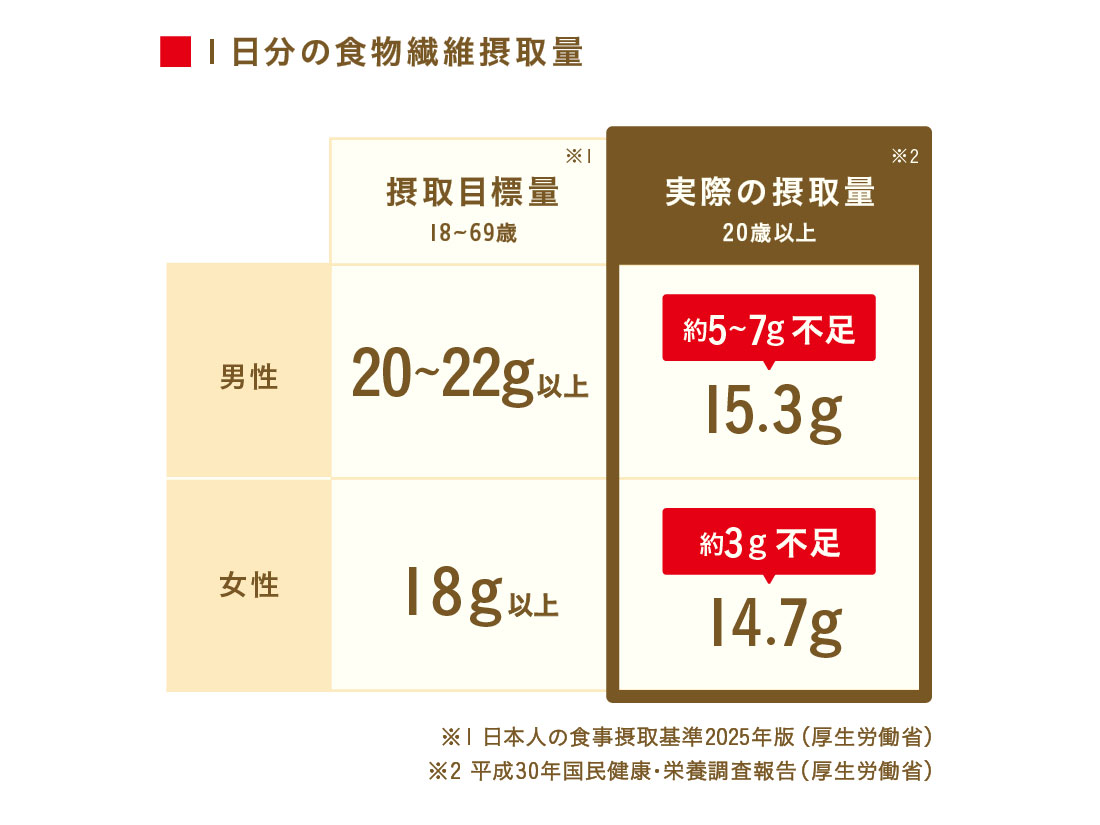 また、WHO(世界保健機関)では食品中に自然に存在する食物繊維を25g/日摂取することを推奨しています。